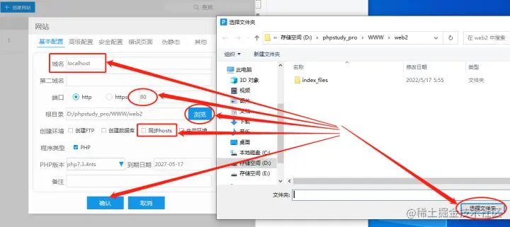 其中,“域名”项我们输入“localhost”;端口为“80”端口;根目录点击“浏览”,找到PHPStudy目录中WWW文件夹下的web2文件夹,并点击“选择文件夹”;将“同步hosts”勾选去掉。在各项设置完成后,就可点击下方的“确认”,完成网页的建立。