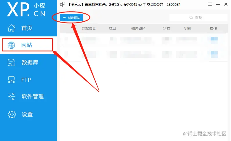 接着,我们回到PHPStudy软件中,点击面板左侧的“网站”选项卡,点击面板左上的“创建网站”按钮。