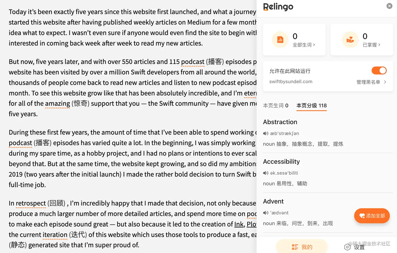 @zhangferry:一个帮助你学习英语的插件,使用起来是这样的。对于一篇英文文章,它可以自动根据设置等级翻译特定词汇,阅读本来就是非常高效的记忆单词技巧,加上这个自动翻译高级词汇的功能,真的非常便捷。还可以将自己不熟悉的单词记录到生词本中,有需要的快用起来吧。