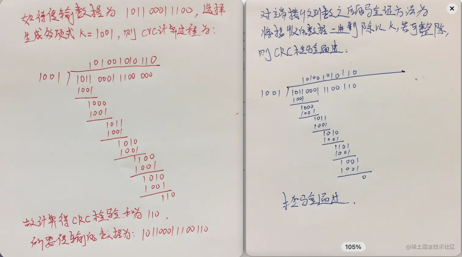 - 用二进制展开后的数据以模 2 除法除以k,数据首位是 1 则商 1,为 0 则商零,最终计算得到的余数即为循环冗余校验和