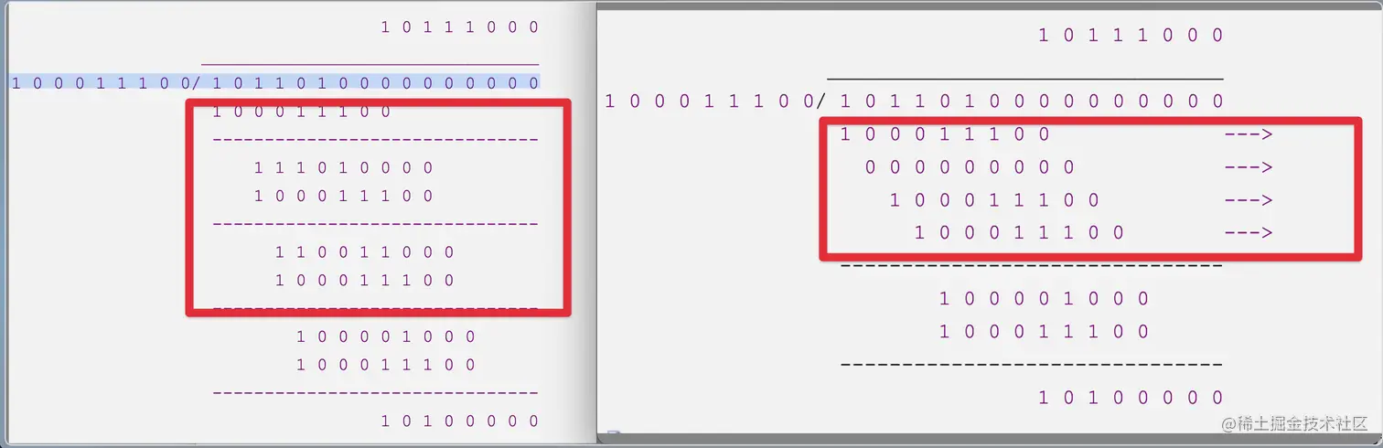 在第三步中提到两个多项式做除法,实际这里并不是采取普通的除法运算,而是模 2 除法,特点是在进行余数计算时,针对每一位的加减运算皆采用不进位 & 不借位思想。即: