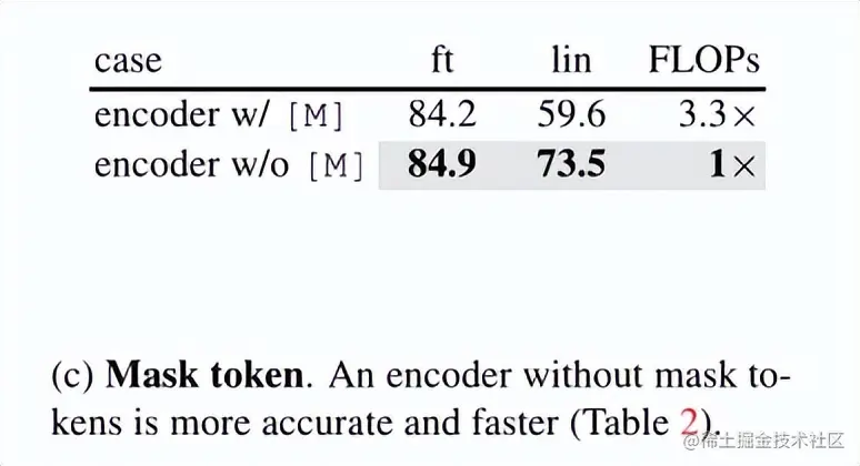 文中,作者对编码器是否保留mask token进行了消融实验,可以看出在编码器阶段舍弃mask token不会对预训练模型的表征能力造成影响,同时能够显著的加速训练进程。