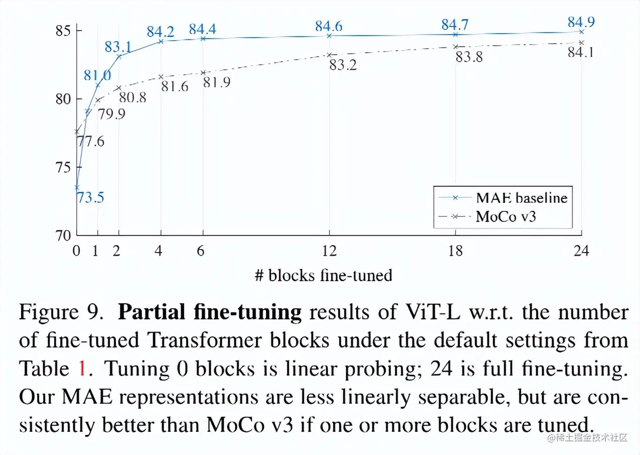 文中除了从linear probing和Finetuning两个角度对模型的表征能力做出评价外,还采用了Partial Fine-tuning的方式进行评价,相比于linear probing这种之前普遍采用的评价方式,能够更好的反映预训练模型对非线性特征的表征能力。从下图可以看出,MAE算法仅仅对一个transformer block进行fintune精度就从73.5%提升到81%。同时与MOCOv3相比,MOCOv3虽然在linear probing的时候具有更高的精度,但是在partial fine-tuning时,MAE的精度都要高于MOCOv3。可以看出,MAE虽然对线性特征的表征能力要弱于MOCOv3,但是具有更好的非线性特征表征能力。