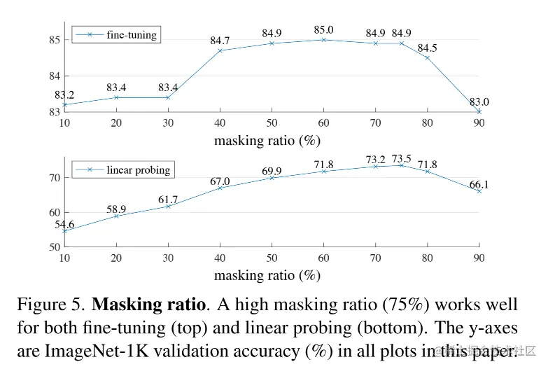关于Masking ratio的实验是MAE最精彩的一部分,随着mask ratio的增加,fine-tuning和linear proing的精度逐渐攀升,甚至到75%还没有下降,这一点打破了BERT(15%)、BEiT(40%)的做法,进一步将mask 预训练方式在NLP领域的成功在CV领域实现复制。