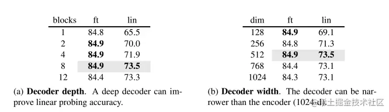 文中,作者对解码器的depth和width两个维度进行对比实验,可以看出一个较轻量化的解码器,就足以是模型学习到有效的表征。