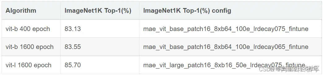 我们在开源框架EasyCV中复现了MAE算法。详细参数配置和实验日志参考github上的自监督modelzoo。
