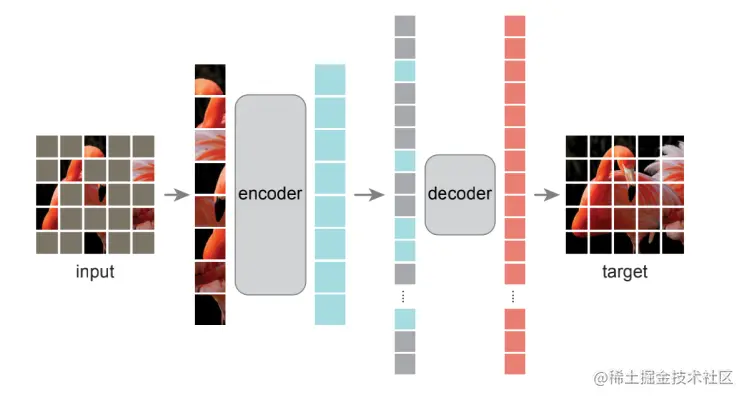 首先,直接采用ViT的做法将图片分成不重叠的patch(如vit-b会将图片划分成16x16的图像块),然后通过均匀采样策略对这些patch进行采样,并丢弃未被选中的部分。MAE所采用的掩码策略有如下两个特点: