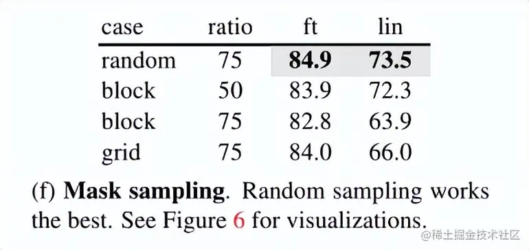2.采用了均匀采样策略可以有效的避免potential center bias(丢弃掉的patch都靠近图片中心)。对mask策略的消去实验如下表所示。