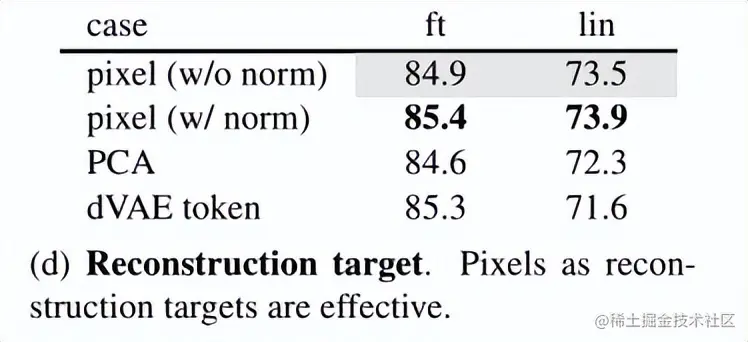 需要额外指出的是,作者使用了归一化后的图像patch作为重建的目标。通过实验证明,这种做法可以提升模型的表征能力。