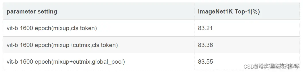 - 在fintune时,MAE的实现使用了mixup+cutmix的数据增广方式,若仅使用mixup精度会下降。