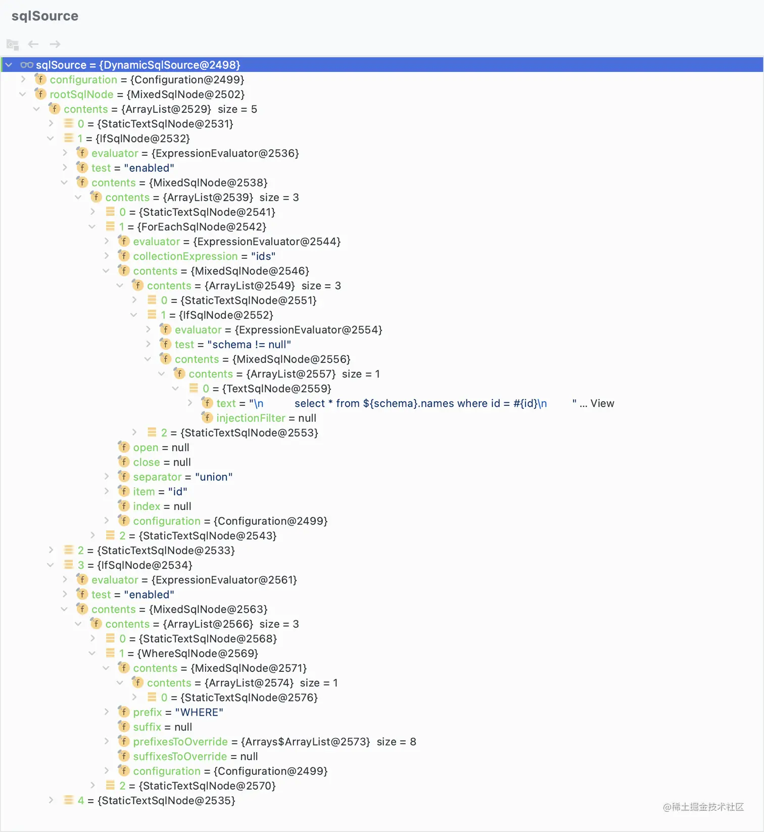 看到这个应该就相当清晰明了了,他按照动态SQL的结构,也封装成了对应的树状结构。