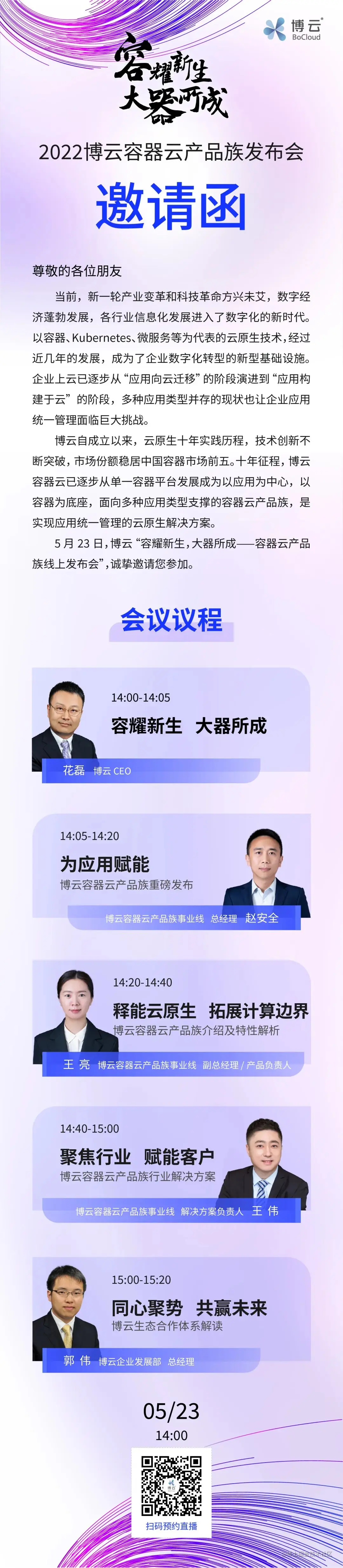 活动预告 | 博云容器云产品族发布会,来了! 博云技术社区 2022-05-20 120 阅读1分钟 博云自成立以来,云原生十年实践历程,技术创新不断突破,市场份额稳居中国容器市场前五。十年征程,博云容器云已逐步从单一容器平台发展成为以应用为中心,以容器为底座,面向多种应用类型支撑的容器云产品族,是实现应用统一管理的云原生解决方案。 5 月 23 日,博云“容耀新生,大器所成—容器云产品族线上发布会”,诚挚邀请您参加。