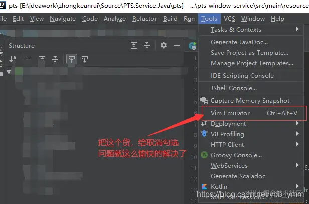 首先打开idea工具,然后点击上方导航栏中的Tools标签按钮,弹出下方子菜单中,点解Vim Emulator。这样就能看到此处已经勾选了,将此处的勾选取消即可完美解决这个Ctrl+c不能正确使用的问题了