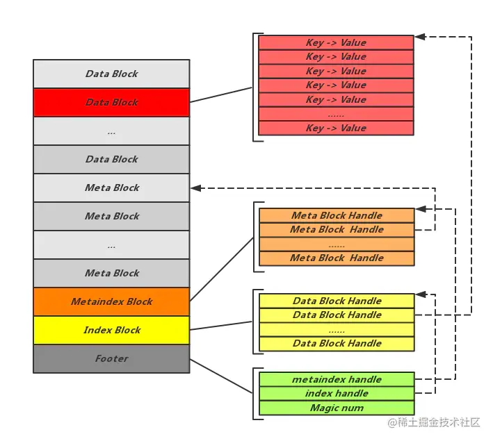 Footer 中的信息,指明了 MetaIndexBlock 和 IndexBlock的位置,进而找到 MetaBlock 和 DataBlock。