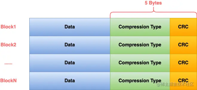 从上面的表格可以看出RocksDB的SSTable除了Footer外其余都是使用Block进行存储的,Block在硬盘上存储的时候,会在实际数据之后加上5个字节的额外内容:compression type、crc,如下图所示: