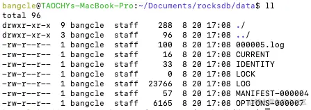 - *.sst: 数据持久换文件(此处的例子没有生成sst文件是因为第一次写数据,数据量小没触发flush操作,数据都在内存的MemoryTable中)