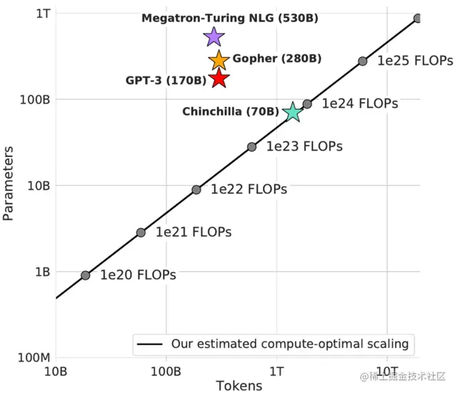 几周前,DeepMind 重新审视了 Kaplan 等人的发现,并意识到:与人们认为的相反,训练 token 的数量对性能的影响与模型大小的影响一样大。DeepMind 得出结论:计算预算应该平均分配给扩展参数和数据。他们用大型语言模型 4 倍的数据量(1.4T token)训练 Chinchilla(70B)证明了这个假设。