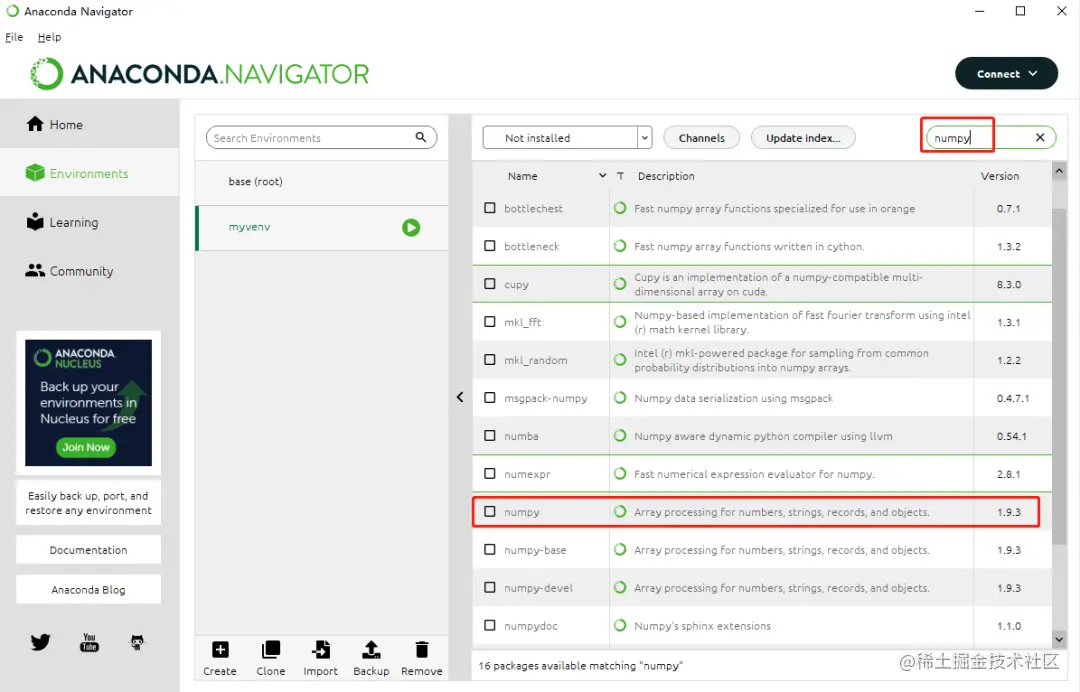 conda remove -n myvenv numpy # 删除指定环境中的指定包