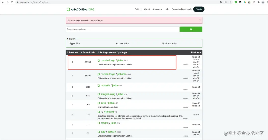 选择其中一个版本,我们选择了conda-forge/jieba模块