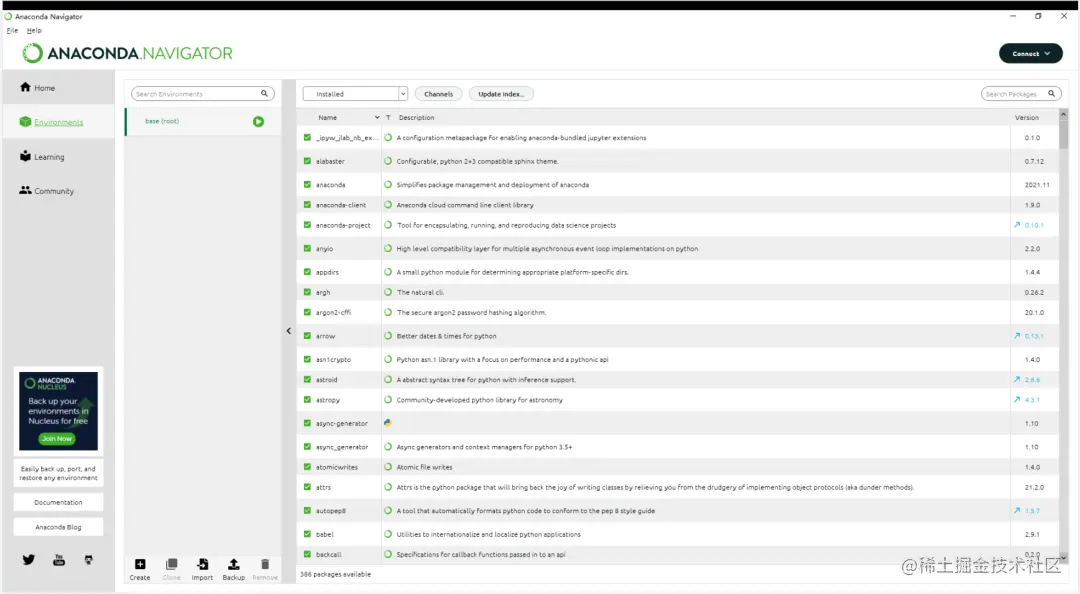 packages 管理:可以使用 conda 来安装、更新 、卸载工具包 ,并且它更关注于数据科学相关的工具包。在安装 anaconda 时就预先集成了像 Numpy、Scipy、 pandas、Scikit-learn 这些在数据分析中常用的包。另外值得一提的是,conda 并不仅仅管理Python的工具包,它也能安装非python的包。比如在新版的 Anaconda 中就可以安装R语言的集成开发环境 Rstudio。
