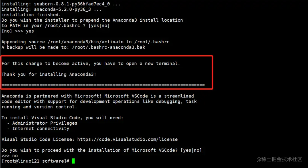 最后一步有一个询问你是否安装vscode,emm如果你没有需要就输入no,毕竟在服务器里面都是用vim编辑器的,没必要多装一个。