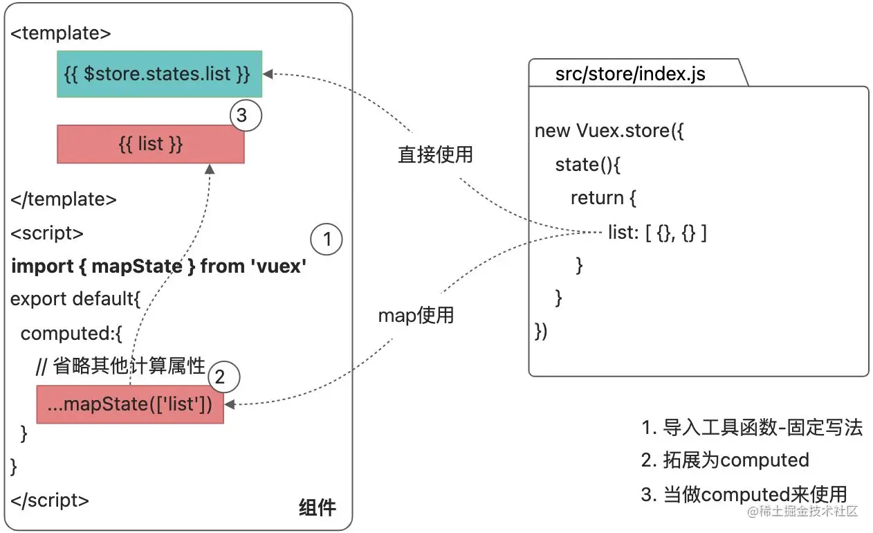 - computed:{ ...mapState() } 这里的...是对象的展开运算符,整体来看是对象的合并。