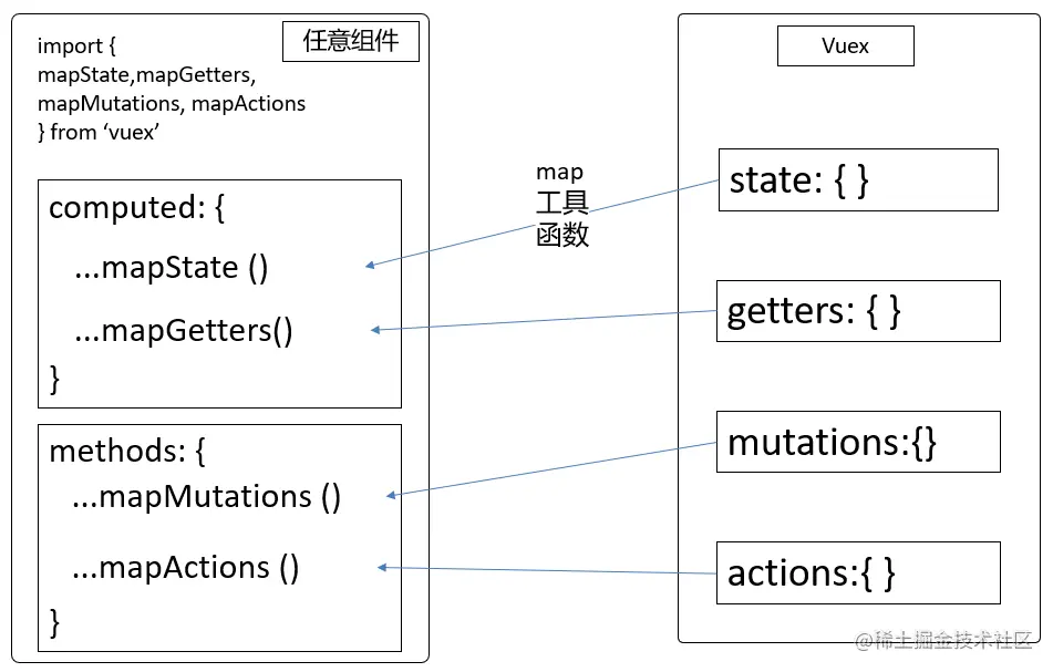 - mapState是辅助函数,将vuex中的数据投射到组件内部;