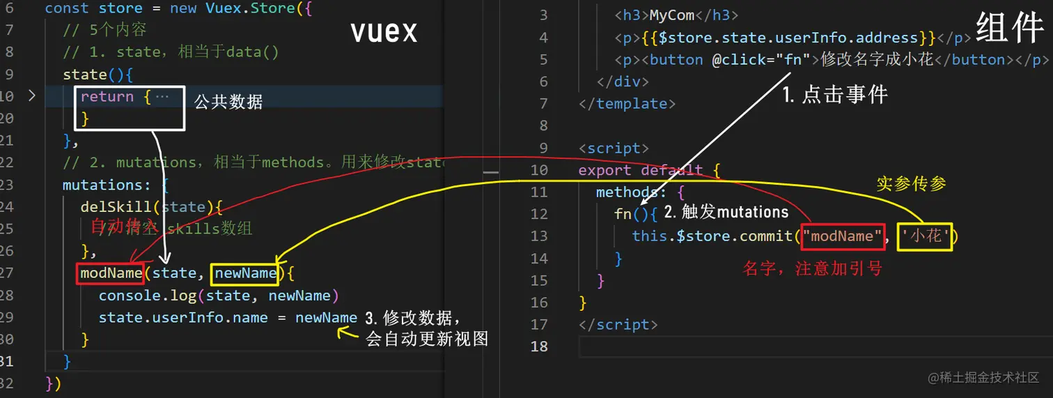 this.$store.commit('mutation名', 参数) - map辅助函数: