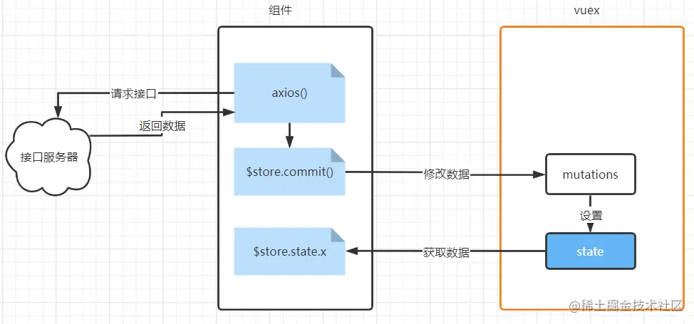 - state: 统一定义公共数据(类似于data(){return {a:1, b:2,xxxxxx}})