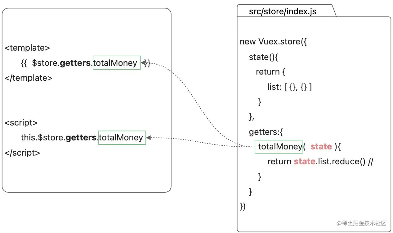 - getters: 类似于computed(计算属性,对现有的状态进行计算得到新的数据-------派生 )