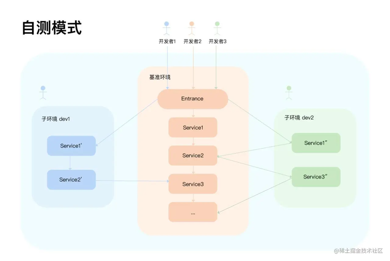 在 Zadig V1.11.0 版本中推出了环境自测模式,工程师可以基于一套含全量服务的基准环境低成本搭建独享的开发者子环境。利用 Istio 和 Tracing 组件的链路追踪和流量动态路由的能力,实现开发者子环境与基准环境联调的目的,从而解决大规模微服务下工程师被环境问题阻塞的情况。
