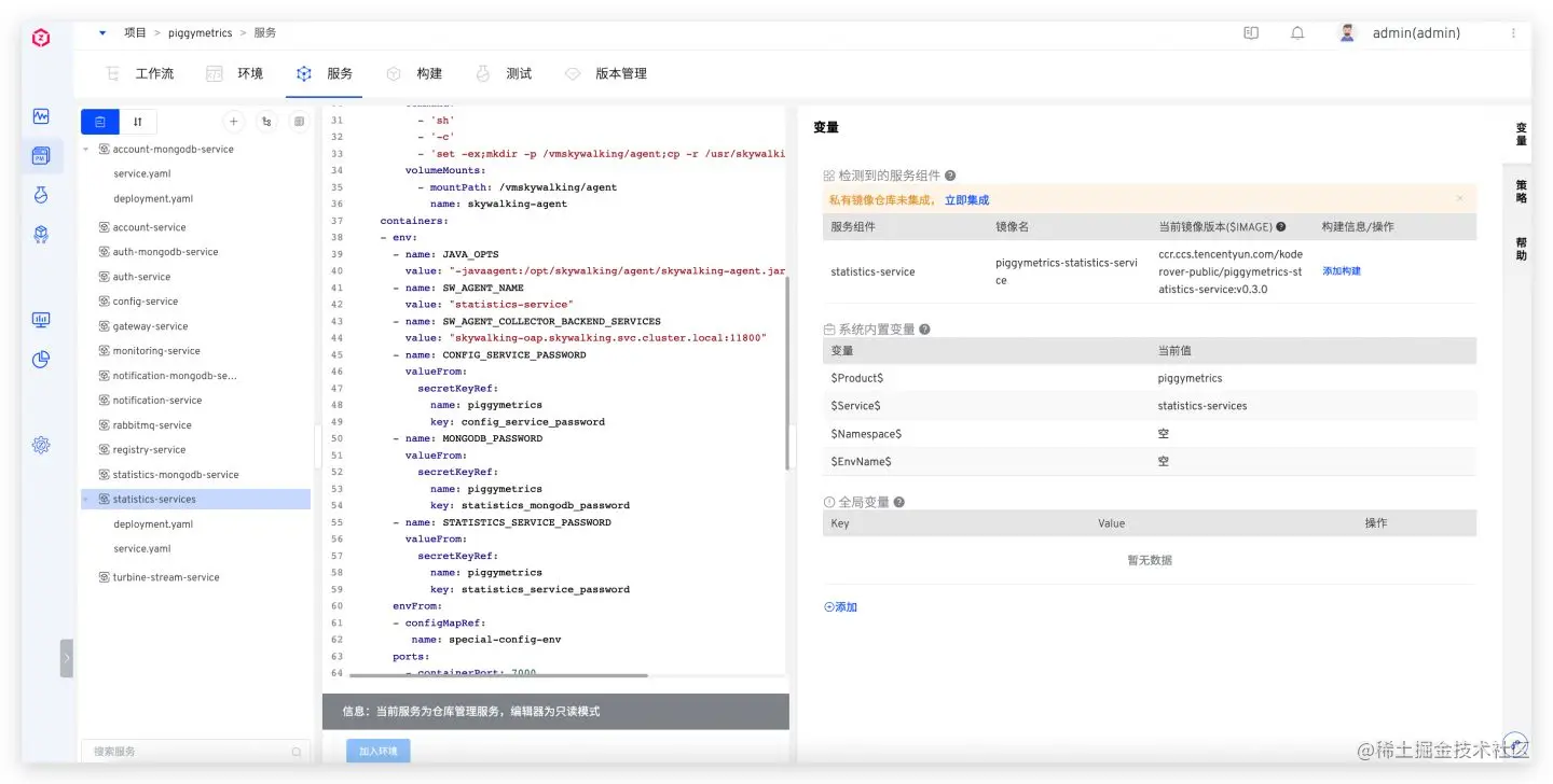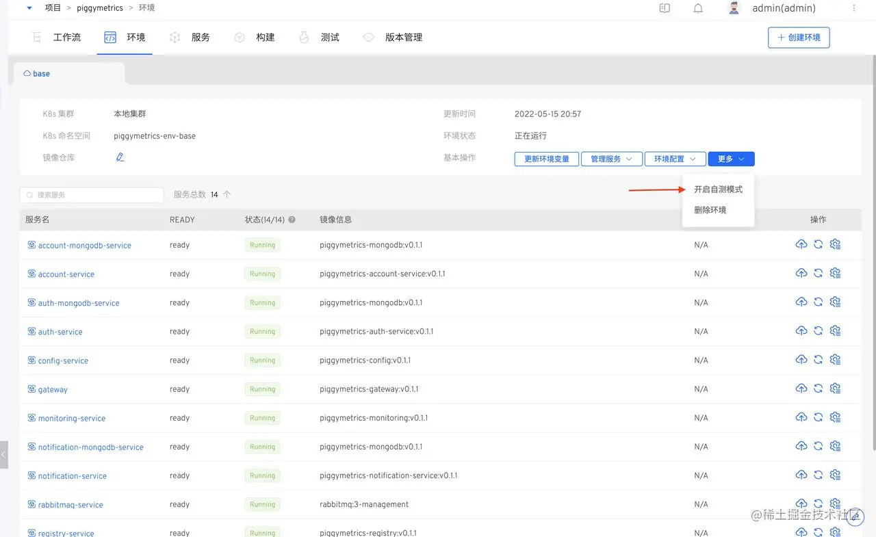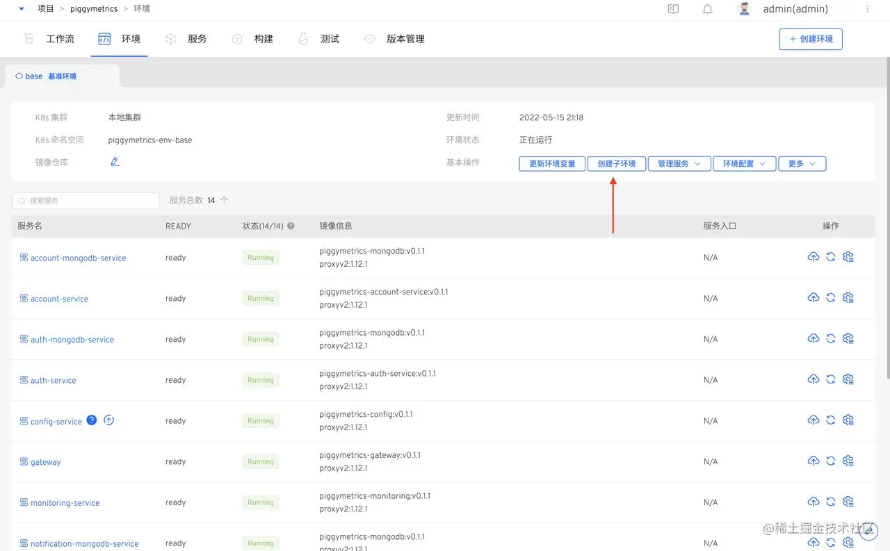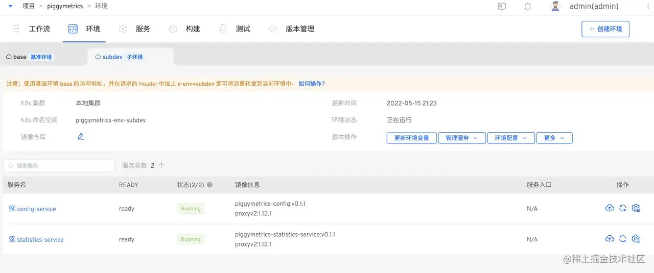 在基准环境准备完成以后即可开启自测模式并创建包含 config-service 和 statistics-service 服务的子环境 subdev.