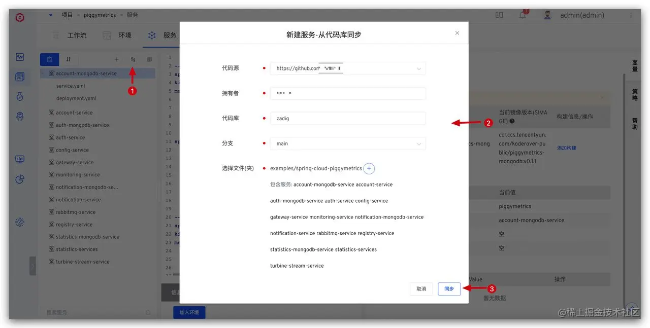 1、在 Zadig 上创建项目 piggymetrics ,配置服务,服务 YAML fork 自 Zadig 代码库,可使用「从代码库同步」方式批量导入服务配置。