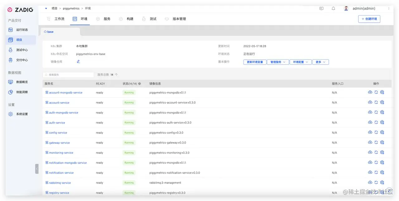 下面以服务网格组件 Istio + 企业采用率非常广泛的 SkyWalking + 典型微服务架构 Spring Boot 项目 PiggyMetrics 为例,演示如何使用 Zadig 自测模式实现工程师日常自测联调过程。