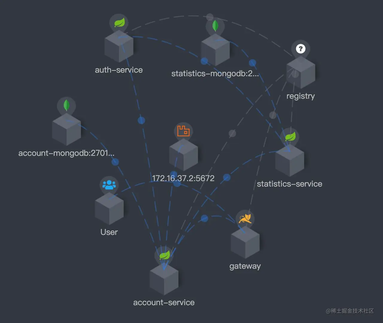 部署完成后,可从 SkyWalking UI 上查看的服务之间的依赖关系如下: