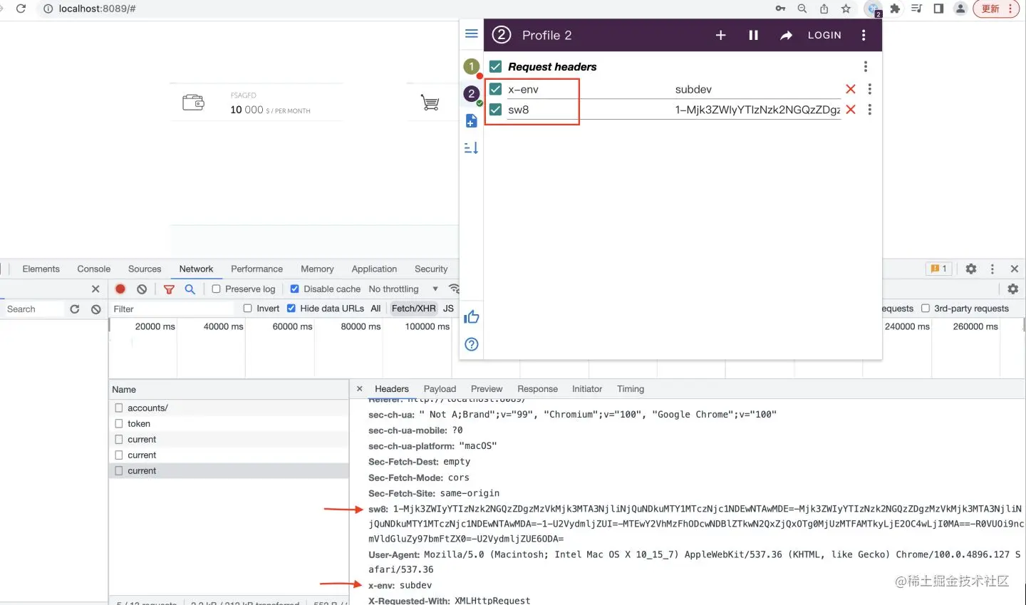 方式二: 使用 curl 命令将请求转发到子环境,使用子环境进行自测联调,请求 header 中添加字段 x-env、sw8。