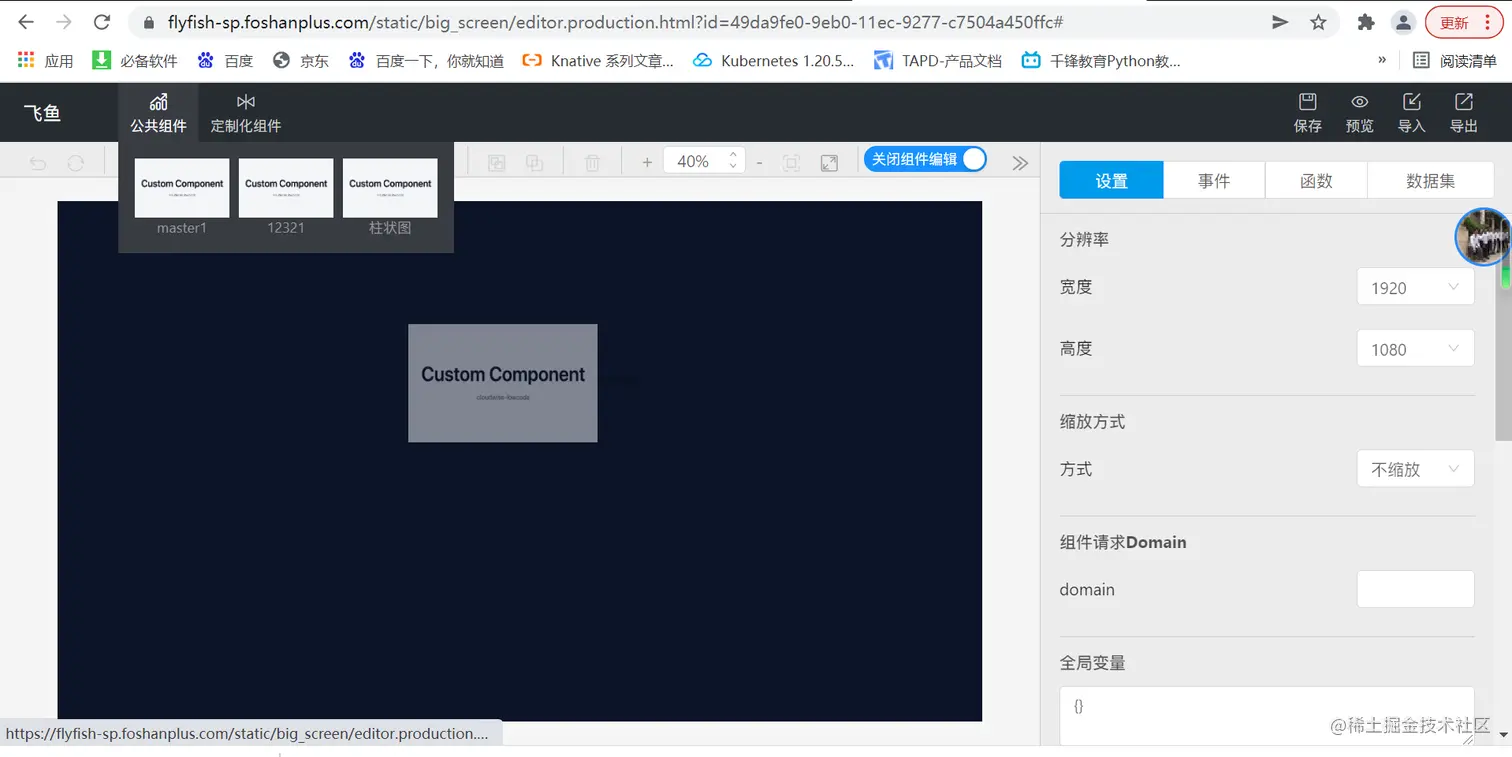 安装配置 FlyFish2.0版本后,组件先在线操作导出,随后再导入无法正常显示,当前使用的mysql,redis,code-server,solution_platform,visual_component_platform均是单独用dokcer做镜像在k8s上运行。