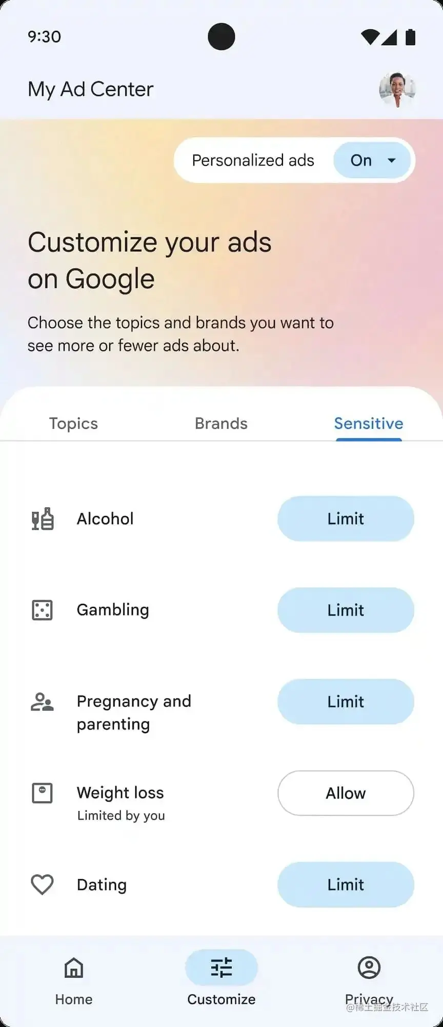 用户输入到“我的广告中心”的主题或品牌,最初不会被传递到这个新的第二广告设置页面。也就是说,如果用户在“我的广告中心”内完全关闭了广告个性化功能,也就能够关闭谷歌和非谷歌所拥有的全部个性化广告资产。