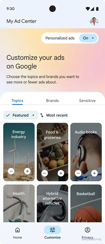 1、关注品牌和话题。 所有谷歌用户现在都可以选择他们想看到的,与他们相关度座高的品牌和话题。这与目前正在测试的「隐私沙盒」中的Topics targeting有很大不同,「我的广告中心」由用户自行完成输入工作。