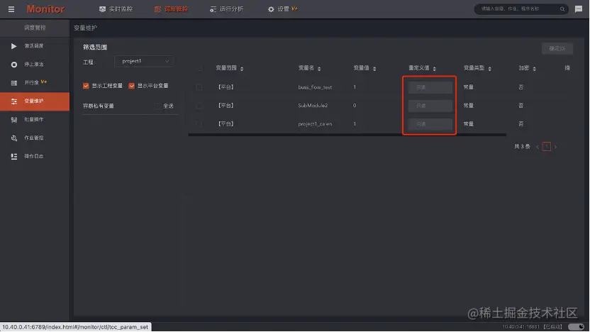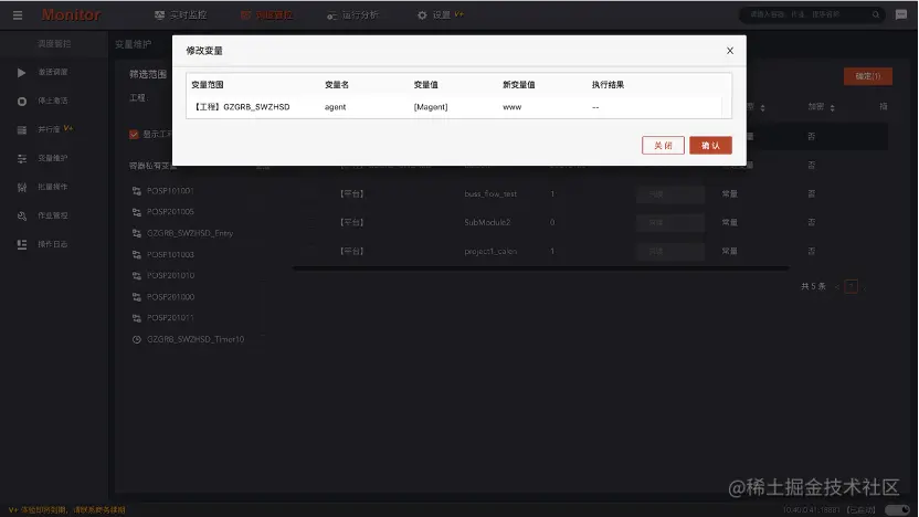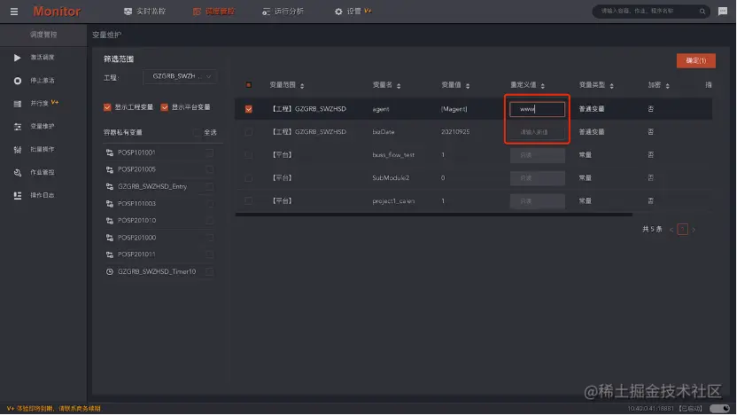 变量分为平台变量(只读),工程变量及作业容器的私有变量。在左侧的筛选范围区域,对变量按工程口径进行筛选。在变量列表的**“重定义值”单元格中输入新值,同时选定需要修改的变量数据行之后,点击“确定”按钮弹出“修改变量”对话框,点击“确定”按钮开始执行。批量执行过程中,可以中断未执行的操作。完毕后在“执行结果”**栏中报告执行状态。