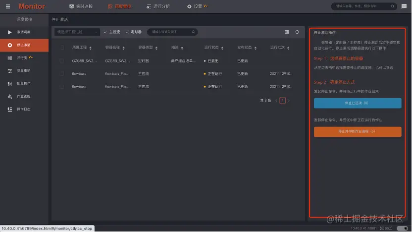 停止激活也是特指停止具备自动化运行特征的作业容器:主控流及定时器。操作过程和前面**“激活容器”**类似,不再累述。停止方式有两种: