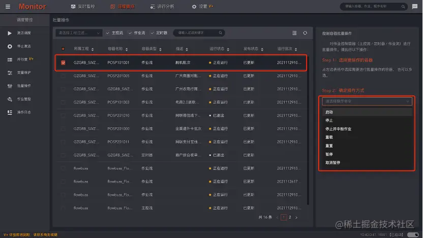 批量操作是对作业容器进行批量**“启动”,“停止”,“停止并中断”,“重置”,“重载”,“暂停”或“取消暂停”操作。列表中展示了所有类型作业容器的相关信息:如运行批次、运行状态、发布状态等。通过工具栏的工程范围、作业容器类型以及关键字筛选作业容器。在列表中选定(可多选)需要操作的作业容器。在右侧操作面板中选择操作命令后,点击“立即操作”按钮弹出“批量操作”执行窗口,点击“确认”**按钮开始执行批量命令。批量执行过程中,可以中断未执行的操作。
