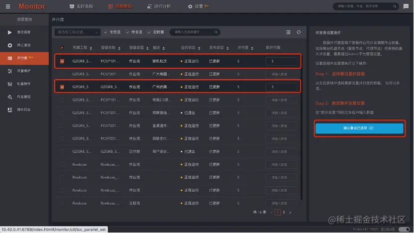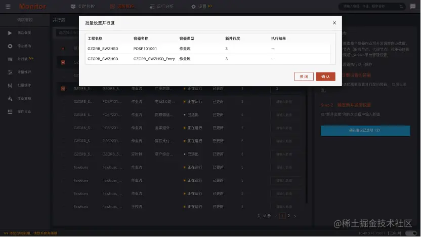 作业容器的并行度用于控制其内部作业同时运行数量。是比平台节点并行度更细粒度的,控制作业并发运行的参数。列表中展示了作业容器当前的并行度。在**“新并行度”单元格中输入数值,同时选定需要修改的作业容器数据行之后,在右侧操作面板中点击“确认重设”按钮,弹出“批量设置并行度”窗口,点击“确定”按钮开始执行。批量执行过程中,可以中断未执行的操作。完毕后在“执行结果”**栏中报告执行状态。