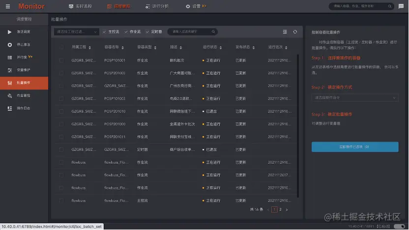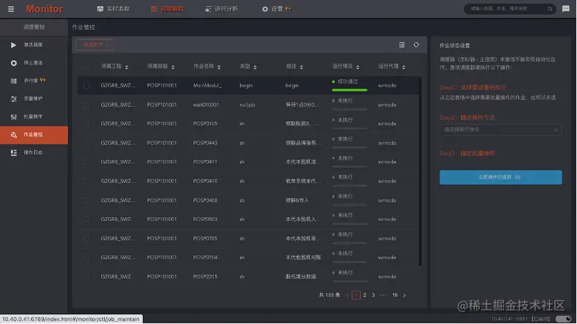 调度管控是指运维监控人员对作业容器,和作业的人工干预过程。对于作业容器来说,可以进行启动、停止,暂停、取消暂停,重置,重载。以及重新设置作业容器的运行参数和并行度。对于作业来说,可以进行执行、运行依赖、中断、中断循环,禁用、禁用一次、启用,强制跳过,锁定,置顶优先级等操作。
