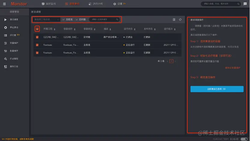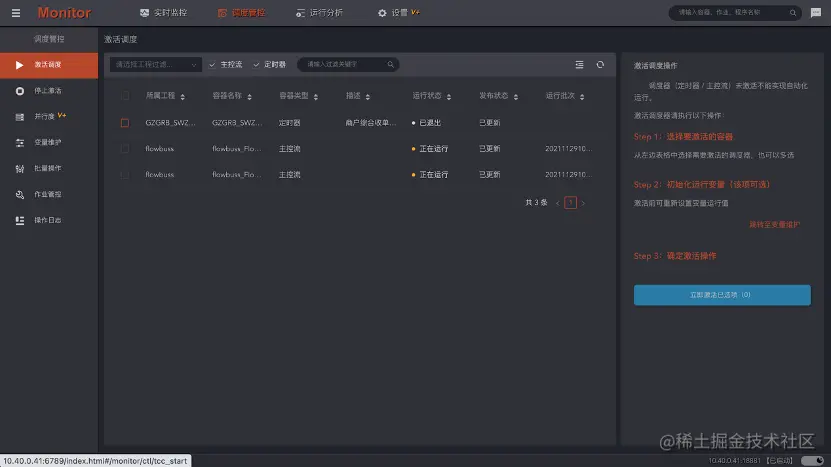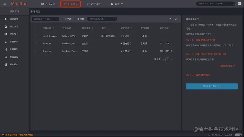 激活调度特指启动具备自动化运行特征的作业容器:主控流及定时器。而不具备自动化运行特征的作业容器:作业流启动后,从开始到结束运行一次后就退出了,不适用激活概念。