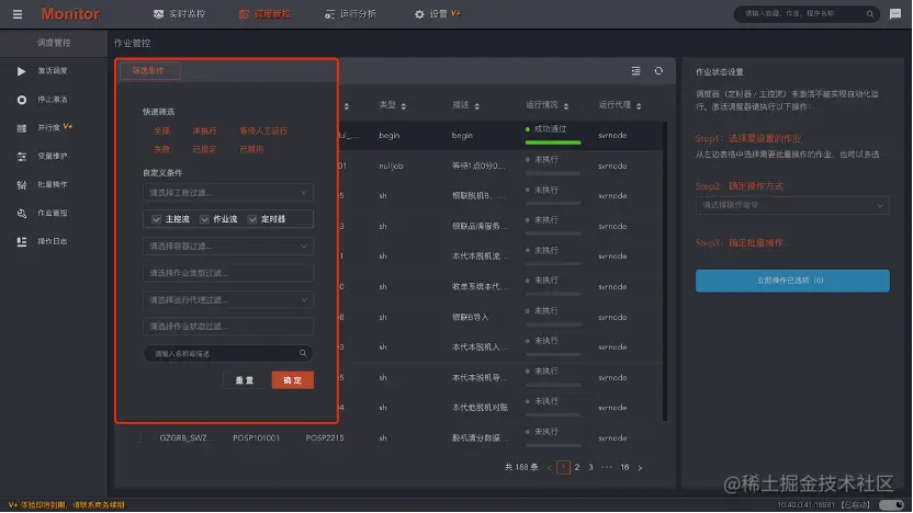 批量操作是对作业进行批量**“执行”,“运行依赖”,“中断”,“中断循环”,“强制通过”,“启用”,“永久禁用”,“禁用一次”,“锁定”,“解除锁定”,“禁用日期计划”,“启用日期计划”或“置顶优先级”**操作。