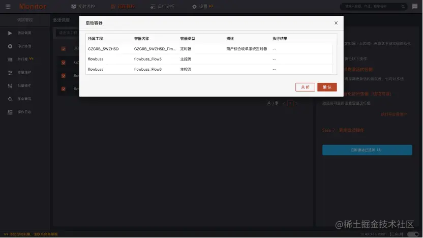 列表中展示了主控流、定时器相关信息:如运行批次、运行状态、发布状态等。通过工具栏的工程范围、作业容器类型以及关键字筛选作业容器。在列表中选定(可多选)需要激活的作业容器。在右侧操作面板中点击“立即激活”按钮,弹出“启动容器”执行窗口,点击“确认”按钮开始激活作业容器。批量执行过程中,可以中断未执行的操作。完毕后在“执行结果”栏中报告执行状态。请注意已经启动的作业容器不能再次激活。