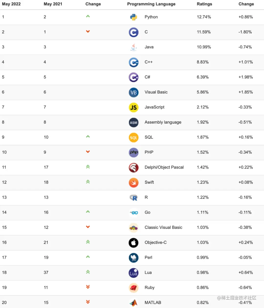 和 4 月相比,本月编程语言 Top 10 并没有明显的位置变化,Top 5 依然是 Python、C、Java、C++ 和 C#。