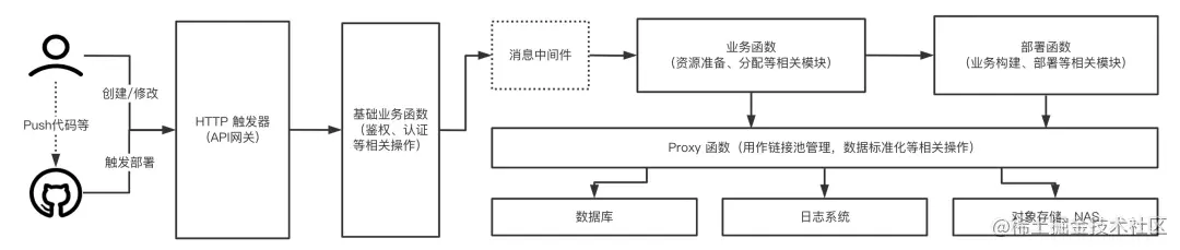 如上图所示,通过 HTTP 触发器(API 网关),基础业务函数将会接收用户在客户端发起的请求,以及 Github 等代码仓库送来的 WebSockets 通知,对这些信息进行基础的处理(包括不限于权限鉴定、身份认证等相关操作),然后通过消息中间件(部分事件并不会通过消息中间件),将不同的事件送达到不同的业务函数中,并进行业务的处理,如果有创建、更新等部署相关事件,则会进一步的下发到部署函数中,进行业务的部署,在整个流程中,会不断的有元数据、缓存数据、日志信息等通过 Proxy 模块,存储到对应的 BaaS 产品中。
