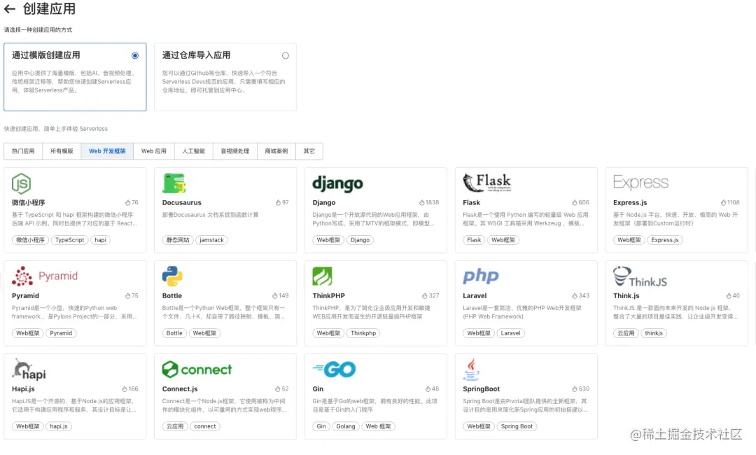 除了快速创建模板应用,开发者也可以选择通过 Github 等代码仓库进行项目创建。